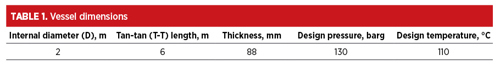 According to API 521,1 the normal liquid level (NLL) is used to determine the wetted surface area, which is then used to calculate the rate of vapor generation. In this case, the NLL for the vessel is obtained from the general arrangement drawing (GAD) and corresponds to 55% of the total vessel volume. However, instead of considering only the wetted area, the entire cylindrical surface is considered for heat transfer. This approach is chosen because the objective is to assess the vessel survivability, rather than the amount of vapor generation, which is typically relevant to RV sizing. The cylindrical vessel area—excluding the bottom since the vessel is supported with a skirt, and the head since it is higher than 7.6 m above the source of the flame—can be calculated using Eq. 1, which matches the area estimated by the proprietary modeling softwarea (~37.5 m2):