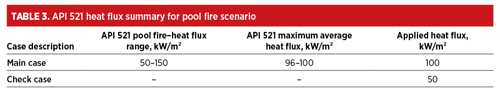 For this case study, a constant heat flux through the fire duration is considered by specifying C1, and setting C2, C3, C4, and C5 to zero. C1 is specified as such: API recommended heat flux for pool fire in (kW/m2) as tabulated in TABLE 3 multiplied by the heat transfer area (m2) resulting in applied heat in kW.