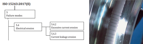 FIGS. 2 and 3. A sample flow of ISO 15243:2017 (FIG. 2, left)1, and fluting on the outer ring raceway of a deep groove ball bearing (FIG. 3, right).