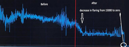 The schematic was implemented in the DCSa and commissioned, as shown in FIG. 4. Once started, this immediately led to zero H2 flaring (FIG. 5), reducing unnecessary production and saving $13 MM/yr.