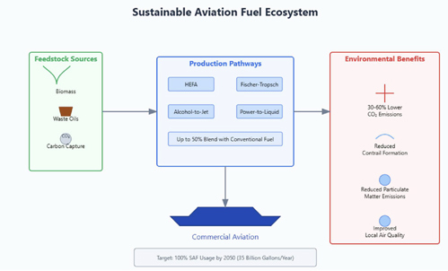 What lies ahead: A transitional or permanent solution? The fate of SAF lies in breaking through the production barriers and integrating it into a larger decarbonization plan. Some experts see the fluctuation as more moderate, since SAF is still considered a transition fuel that will be replaced by such developments as H2-powered jets or battery-electric solutions.29 Some industry professionals believe that, due to its suitability with many current engines and infrastructure, SAF could maintain a continued position in long-range commercial flights for years to come, especially in intercontinental travel, which presents a general issue in power-to-weight challenges of competing technologies. Other essential factors include H2 and electrical energy storage, and the suitability of e-fuels for hybridization with SAF. PtL fuels derived from synthesizing renewable H2 and captured CO₂ are assayed for blending with SAF to raise synthetic volumes and lessen biomass requirements. These will be critical in implementing future and potent strategies for decentralized and global aviation decarbonization.7,10
