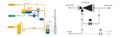 - Gas flaring collection and compression. The collection and pumping of recovered gas to pipeline infrastructure (single or multi-phase) is a well-established and proven method to reduce flaring and venting. The implementation of this approach depends on the availability of pipelines and process infrastructure. The selection of compressor or ejector equipment, which is the main part of the FGRS, depends on many factors such as installed cost, process requirements, available plot space, utilities availability, efficiency, and operating and maintenance requirements. Different types of compressors can be used for an FGRS, such as dry screw compressors, sliding vane compressors, reciprocating compressors, liquid ring compressors and oil injected (or oil flooded) screw compressors (both single and dual screw). Ejector systems can also be utilized onsite on specific conditions and the availability of motive fluid media.