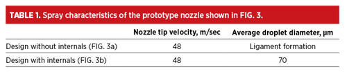 It was observed that for the design without internals (FIG. 3a), proper atomization was not taking place, and the spray was dominated by ligaments instead of fine droplets. TABLE 1 details the spray characteristics for the designs shown in FIGS. 3a and 3b.