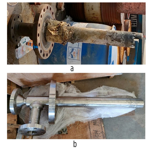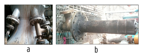 FIG. 4. A view of the feed injection nozzlesa installed in one of HPCL’s refineries (B). An image of the feed injection nozzlesa after 3 yr of operation.