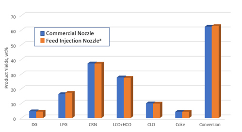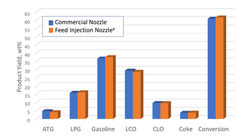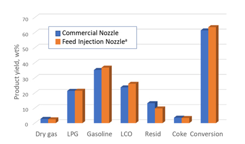 To evaluate the performance of the feed injection nozzlesa, test runs were conducted before and after the TAR under identical operating conditions. FIG. 5 shows the comparison of the product yield pattern and overall conversion before and after the FCCU TAR. The nozzlesa provided a 1.2% higher conversion with 1.5% higher gasoline, 0.3% lower dry gas and 3.5% lower residue yields vs. the initial commercial nozzles. The increase in gasoline yield and the decrease in dry gas and resid yields are an indication of enhanced catalytic cracking due to better atomization of the feed.