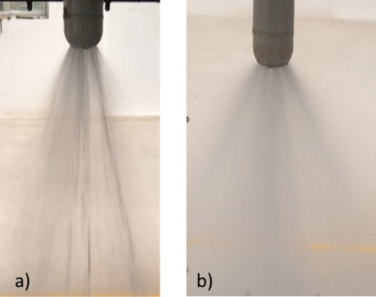 FIG. 3. A visual comparison of spray patterns: obtained in the absence of internals (a) and obtained with a unique set of internals (b).