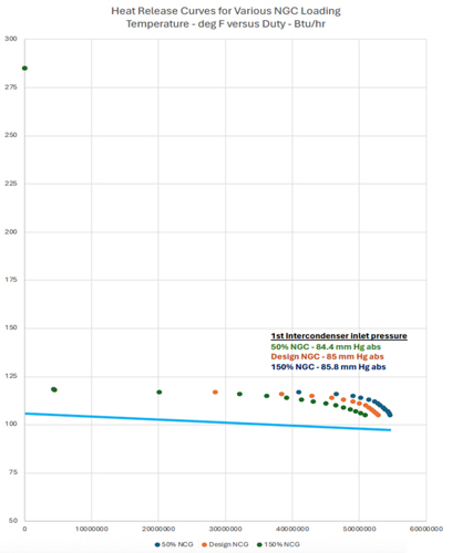 TABLE 2 provides a comparison for how the first intercondenser would perform with varied NCG loadings while not being influenced by the performance of the second-stage ejector, and what actually occurs in practice as the ejector system responds to changes in NCG load.