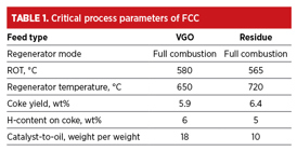 The applicability of oxy-combustion in FCC/Resid FCC (RFCC) units. The FCCU can be designed for lighter feedstock as well as heavier or residue feedstock. Lighter feedstocks such as VGO have lower coke making tendency compared to heavier or residue feedstocks. Maintaining the desired regenerator temperature [650°C–700°C (1,202°F–1,292°F)] for the full combustion of coke is crucial while processing lighter feedstocks. Sometimes, the regenrator might not reach the desired temperature, leading to incomplete combustion of coke on the catalyst. The recycling of clarified oil (CLO) becomes necessary to maintain the regenerator temperatures. In view of this, a reduction in regenerator temperature in the FCCU is an infeasible solution.
