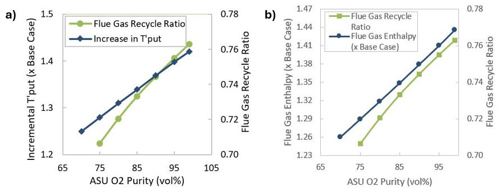 Scenario 2: Constant flue gas rate at higher feed throughput. As seen in Scenario 1, while implementing oxy-combustion at a constant flue enthalpy or constant regenerator temperature, SA and flue gas decreases, leading to reduced superficial velocity in the regenerator. This provides an opportunity to operate the unit with higher feed throughput. Accordingly, feed throughput can be maximized to the extent that the flue gas molar mass rate is the same as that of Base Case operation and, therefore, superficial velocity in the regenerator is not increased beyond Base Case operation. The incremental heat produced from additional coke is balanced between riser reactor heat demand and the enthalpy of flue gas. This matching can be done by altering the flue gas recycle ratio. The change in feed throughput, the corresponding FG enthalpy and FG recycle ratio as a function of ASU O2 stream purity are shown in FIG. 7.
