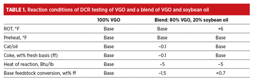 Bryden, et al. described a ~15% lower endothermic heat of reaction from 100% soybean oil processing relative to cracking vacuum gasoil (VGO) in a Davison Circulating Riser (DCR™) pilot plant.7 The FCC heat balance responds to the lower heat of reaction by requiring a lower catalyst-to-oil (cat/oil) ratio to maintain the same riser outlet temperature (ROT), thereby reducing coke yield. Many units limited by catalyst circulation and/or air blower capacity may alleviate that constraint by replacing some traditional feedstock with a renewable bio-based feedstock. Reduced cat/oil ratio and coke demand results in a lower conversion of the base feedstock. This can be offset by increasing ROT or Ecat activity.