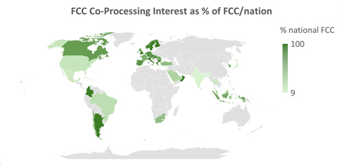 FIG. 1. The authors’ company’s visibility of interest in FCC coprocessing in percentage of FCCUs per nation.