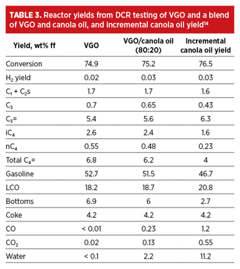 TABLE 3 summarizes yield data from a DCR pilot plant study for the coprocessing of canola oil, with VGO as a reference fossil feed and a typical Ecat. This study showed the blending of canola oil with VGO caused a slightly higher propylene yield, slightly lower C4= and gasoline yield, higher LCO yield and a significantly lower bottoms yield. As expected, COx and water yield increased with canola oil content.