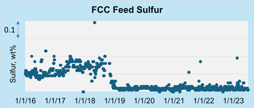 FIG. 3. Unit A’s FCCU feed sulfur decreasing over the years due to increased hydrotreating to meet Tier 3 gasoline sulfur specifications.