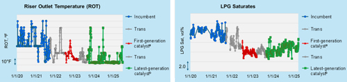 FIG. 4.Unit A’s ROT decreased over the years through a change in catalyst. The catalyst changes and lower ROT resulted in lower light saturates (propane, n-butane, i-butane). The catalyst periods are shown along with the transition between catalysts.