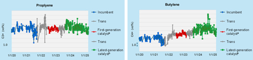 FIG. 5. Unit A’s propylene and butylene production. Through the catalyst changes, propylene production remained constant, while C4= increased by 2.5 vol%.