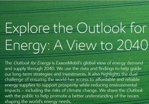 The Outlook for Energy is ExxonMobil’s long-range forecast developed through data-driven analysis, reflecting broad knowledge of energy markets and the expertise of economists, engineers, and scientists. It examines energy supply and demand trends for approximately 100 regional/country areas, 15 demand sectors and 20 different energy types. ExxonMobil uses the forecast as a foundation for its business strategies and to help guide multi-billion dollar investment decisions.