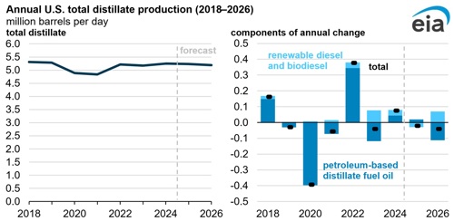 U.S. total distillate inventories forecast to end 2025 and 2026 at multiyear lows