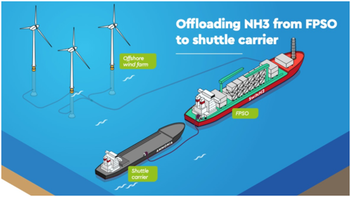 The FPSO will utilize treated seawater and use electrolysis to produce green hydrogen. This hydrogen will be combined with nitrogen extracted from the air to create green ammonia. Once synthesized, the ammonia will be condensed and stored onboard. It will then be transferred to carrier ships via a floating hose system for transport to ports where it can be used as a marine fuel or cracked back to hydrogen for industrial use.