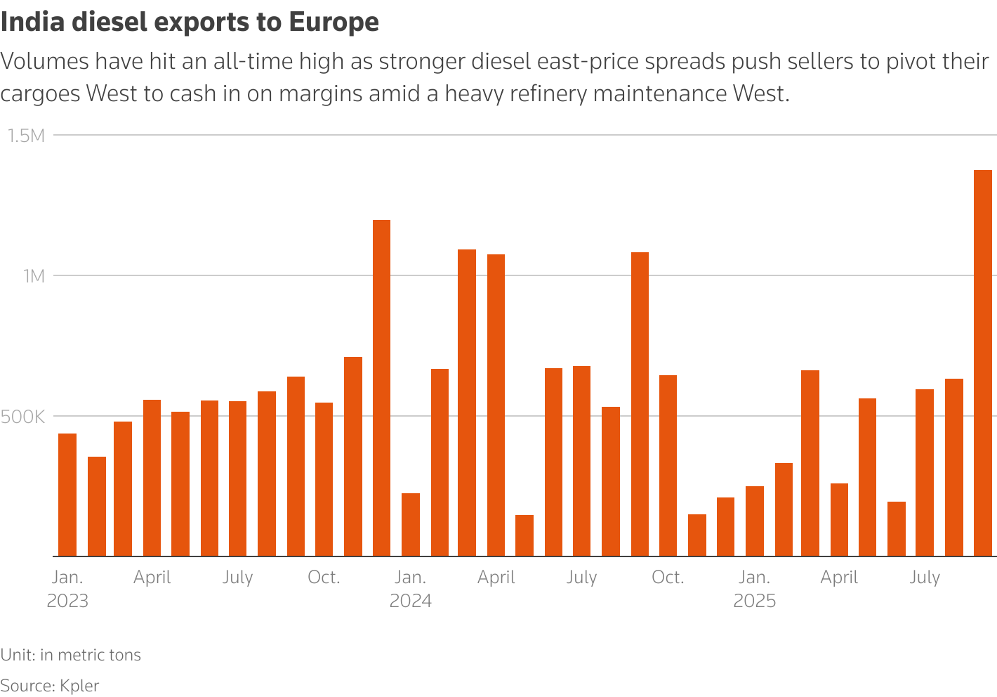 East-West spread widens. The diesel east-west spreads averaged $45 per metric ton in September, up from less than $30 in August, LSEG pricing data showed, spurring traders to move the product to Europe.