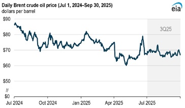 Crude oil prices. The Brent crude oil price traded in a narrow range in 3Q25 as expected increased production from OPEC countries offset geopolitical tensions. The Brent price began the quarter averaging $70/b in July, following the Israel-Iran 12-day war at the end of 2Q25, before declining to an average of $67/b in August and $68/b in September.