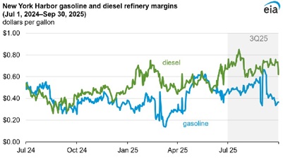 Refinery margins. Diesel crack spreads—a measure of the refinery margins for diesel—at New York Harbor reached a high of 85 cents per gallon (gal) in July, its highest level since February 2024 and almost double the crack spread from the same time last year. This rise was partly in response to elevated pressure from international markets as geopolitical tensions threatened supplies from Middle East refiners. These pressures eased going into August, and diesel crack spreads fell as low as 60 cents/gal, dropping below the previous five-year (2020–24) average. Diesel crack spreads began to climb slowly again in September. This climb partly reflects renewed international pressure on distillate markets following disruptions to Russia’s distillate production and a Russian ban on diesel exports following attacks on its refineries.