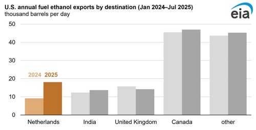 Increased fuel ethanol exports to the Netherlands accounted for most of the growth from 2024 through July 2025, likely reflecting growing demand in Europe. Some of Europe’s busiest trade ports are in the Netherlands. Vortexa tanker tracking data indicate that as the Netherlands has increased fuel ethanol imports from the United States, it has also increased exports to the United Kingdom, France, and Ireland.