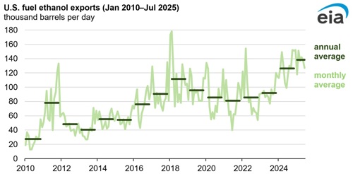U.S. fuel ethanol exports are on track to set new records. In the first seven months of 2025, U.S. fuel ethanol exports averaged 138,000 barrels per day (b/d)—the highest January through July average in our data, which goes back to 2010, and 9% more than 2024's annual record of fuel ethanol exports. Growing international demand and a slight increase in production capacity are driving the high fuel ethanol exports this year.