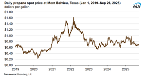 Inventories grew quickly earlier this year because of growing domestic propane production, particularly in the Gulf Coast region. This production growth outpaced international demand for U.S. propane exports, which have increased slightly throughout 2025, despite changes in tariffs that affected propane export volumes earlier in the year.