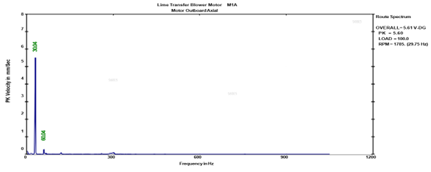 Results. After the structural modifications, the vibration levels drastically reduced at the motor DE (from 5.4 mm/sec to 2.5 mm/sec peak) and NDE (5.6 mm/sec to 2.4 mm/sec peak) axial directions (TABLE 3).