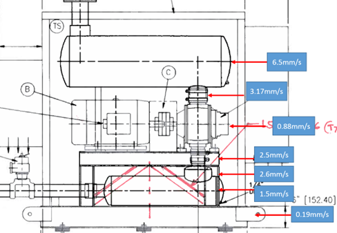 The Equipment Consulting Services Department (ECSD) has requested the end user to take vibration readings on several locations. Measurements are shown in FIG. 4.