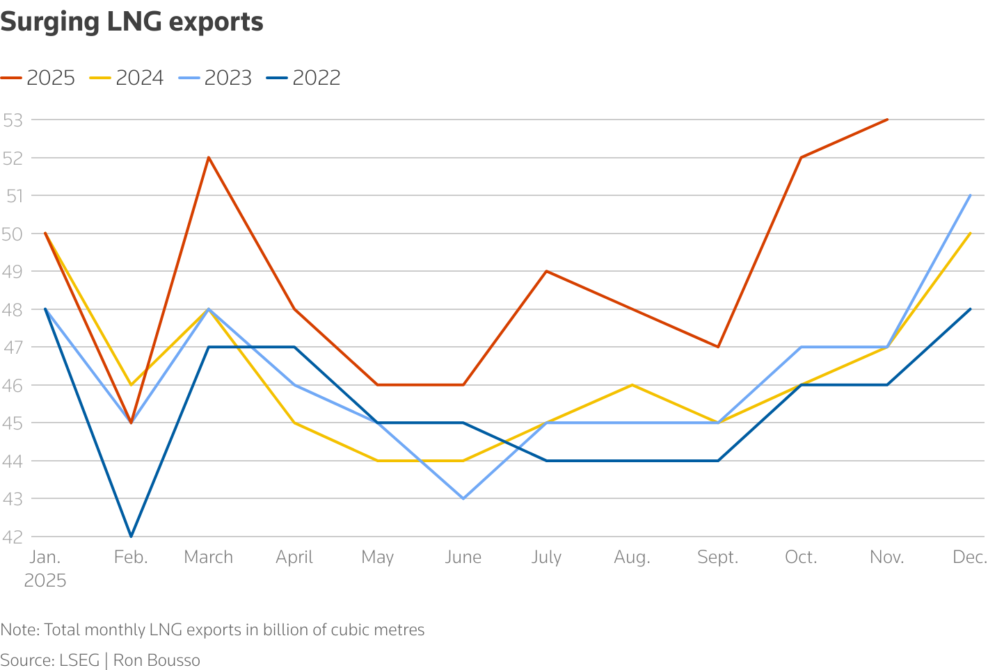 Between 2025 and 2030, new LNG export capacity is expected to grow by 300 Bm3y, a 50% jump, according to the IEA, with around 45% coming from the U.S., the world's biggest exporter of the fuel.