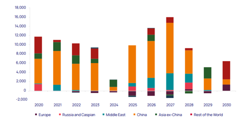FIG. 2. Global ethylene capacity change by region (kt).