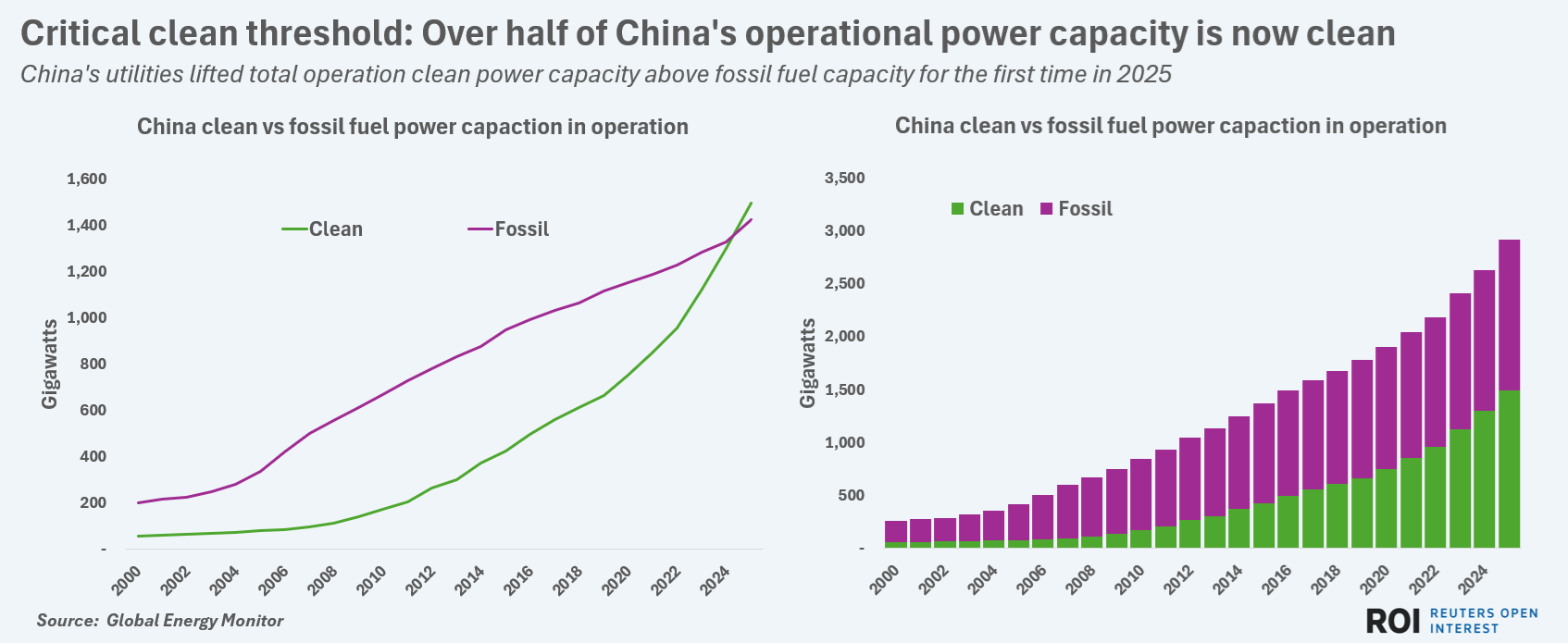 The world's top polluter crossed a critical energy transition threshold in 2025 by deploying more clean power capacity than fossil fuel generation capacity for the first time.
