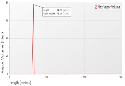 As shown in FIG. 5, the vapor cavity volume is largest in the piping at 64.28 m—i.e., the inlet of the heat exchanger. The vapor volume is considerable (approximately 78 liters), which is quite large for a 4-in. diameter pipe. Therefore, this vapor volume is a risk for this system.