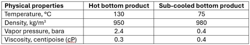 Steady state conditions. The stripper column’s bottom product pump (centrifugal pump) transfers the stripped bottom product at a rate of approximately 18,000 kg/hr during normal operation. The column’s bottom product enters the heat exchanger at an inlet temperature of 130°C which gets cooled to 75°C in the heat exchanger. Physical properties of the fluid are shown below in TABLE 1.