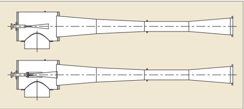 FIG. 3. A properly functioning ejector with shockwave (top), and a broken ejector performance with loss of shockwave (bottom).