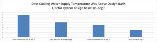 Summertime instability. A recent survey of refiners concluded that summertime ejector system’s performance instability due to elevated inlet cooling water temperature is a top priority to address. Summertime performance breaks are a major problem, resulting in yield losses along with profit shortfalls. At times, a performance break may occur during the hottest hours of the day, while in the evening, ejector system performance might return to normal. At other times, a performance break can span the summer months.