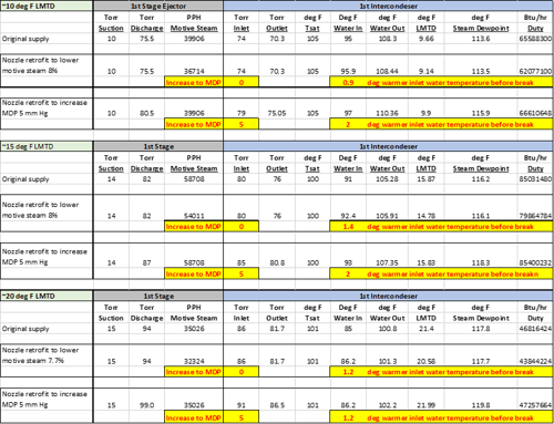 A recent analysis for three different first intercondenser LMTD conditions was undertaken to define if reduced motive steam or increased maximum discharge pressure would provide more benefit when addressing increased cooling water inlet temperature (TABLE 1). In each case, increased maximum discharge pressure offered the better option to address increased cooling water temperature. Again, the lower the LMTD of the first intercondenser, the greater the benefit is of increasing maximum discharge pressure rather than lowering motive steam usage.