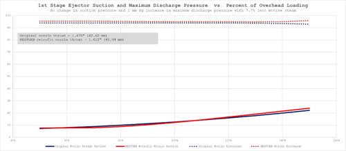 FIG. 2 depicts the original suction capacity and maximum discharge pressure curves, and the curves using 7.7% less motive steam with a new nozzle retrofit. A motive nozzle with a 1.612-in. (40.9 mm) throat will use 7.7% less motive steam than the original supplied nozzle with a 1.678-in. (42.6 mm) throat.