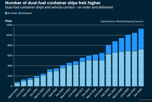 In total, 1,126 dual-fuel container ships and vehicle carriers have now been either delivered or are on order, the data showed. That marks an increase of 28% compared with the previous year, indicating that newbuilding orders for lower-emissions fuel vessels continued even after the IMO delay.
