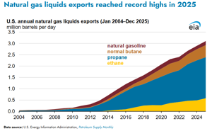 Natural gas liquids (NGL) exports reached 3.1 MMbpd in 2025, growing 7% from the previous year. These fuels are primarily extracted from the natural gas stream. NGL plant production has increased every year since 2005, driven by higher production of NGLs and more global demand for NGLs, especially as petrochemical feedstocks.